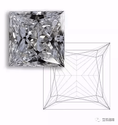 起源:上世纪中期,由比利时工匠发明,此种切工被不断完善,衍生出一系列改良形式。由于其改良形式兼有阶梯型切工的特点,所以也可归类于混合型切工。方形切工拥有方形或长方形外形,通常有76个刻面。方形切工可多样化,但普遍冠部较浅,台面较大,亭部较深。此种切工原石留存率高于其他明亮型切工方式,但不适用亭部较浅的宝坯。尖角处和亭部刻面产生的亮度和闪烁降低了包裹体的可见度,也稍“提高”了宝石的颜色级别,并且同样重量的方形切工宝石与圆形切工宝石相比,外形显得要大15%左右。方形的外形适合用于宝石紧密排列的无缝镶嵌,这是其他形状的宝石所无法做到的,但镶嵌时需要保护尖角。