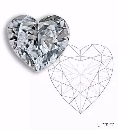 起源:近代宝石外形以对称得两个翼瓣、正中的凹槽和底部的尖角组成,似心形。心形切工宝石全深较浅,适合形状不规则且整体较扁的宝石原石的,原处凹槽位置的包裹体可以被剔除,以提高宝石净度,但此种切工原石留存率较低。心形宝石的外形评价主要注重两侧翼瓣对称、形状饱满。
