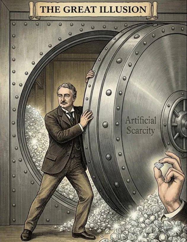 转折点出现在南非大矿被发现之后。巨量钻石被挖出来,如果照实投放市场,价格早就跌成普通宝石。于是,戴比尔斯登场了。