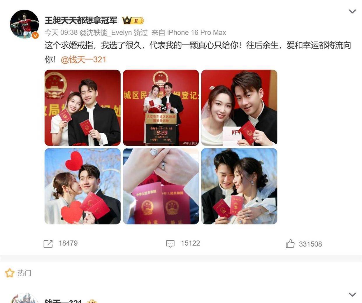 2026年2月7日13点14分,王昶的社交媒体账号跳出一条更新。 没有铺垫,直接是一张红底结婚证照片,配文简洁而有力:“这个求婚戒指,我选了很久,代表我的一颗真心只给你。 ”