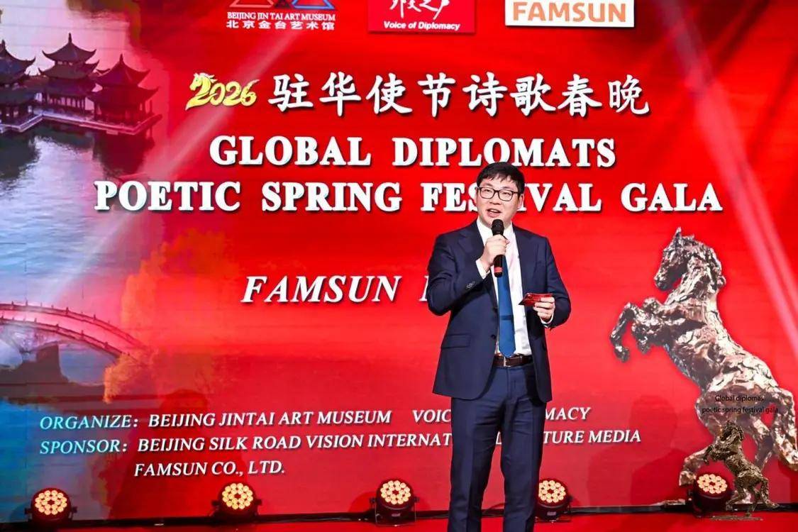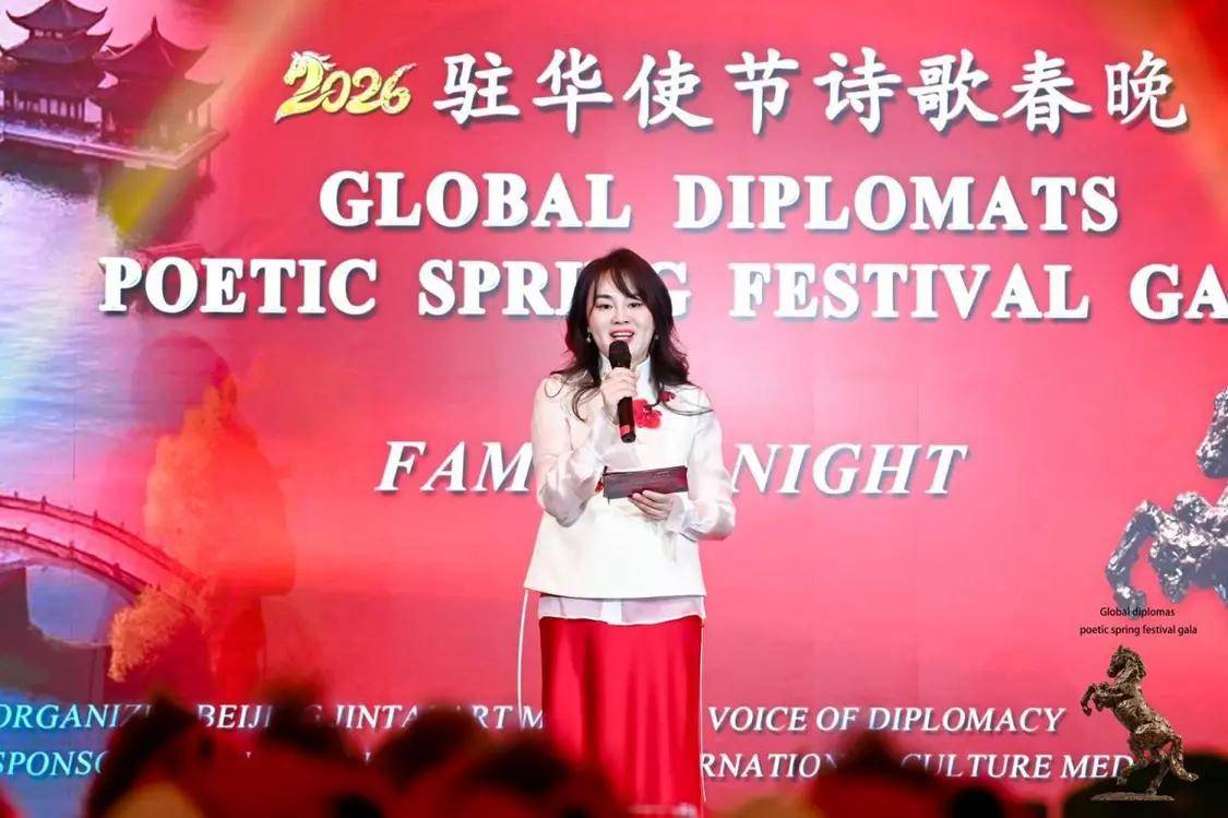 北京金台艺术馆副馆长罗肖代表主办方致辞,她热烈欢迎各国使节莅临金台艺术馆,向各国驻华使节致以新春问候。北京金台艺术馆自1996年创办以来,始终以“融通中外、以艺传情”为使命,搭建中外文化交流桥梁。2026丙午马年,活动以诗歌与艺术为纽带,让驻华使节共赏文艺、同品年俗,生动展现“各美其美、美美与共”的文明交流理念,进一步增进中外友谊,共迎新春。