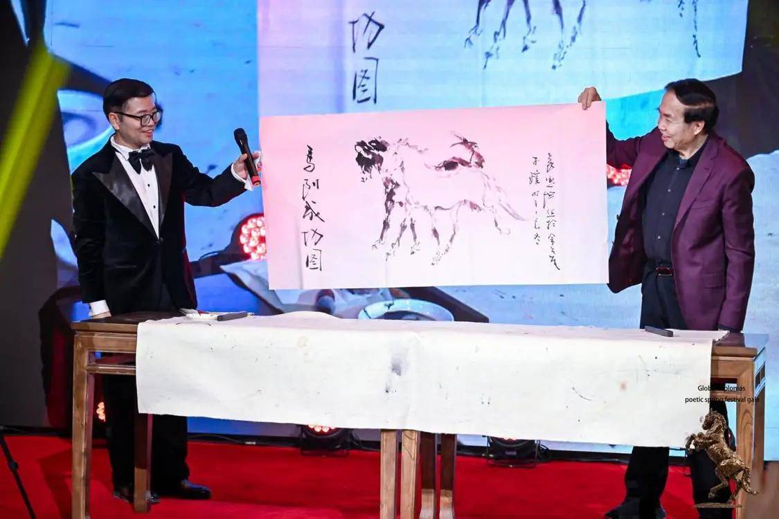 作为将中国生肖文化推向国际的艺术使者,袁熙坤先生曾应邀创作虎年、牛年等系列生肖作品。此次于诗歌春晚即兴挥就的《马到成功双骏图》,不仅延续了他“以形写神”的写意精神,更融入了对“一带一路”倡议下万马奔腾新图景的诗意表达。
