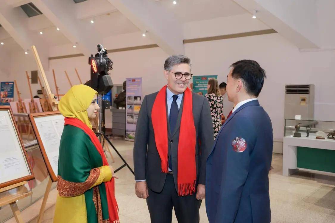 使节们抵达时,主办方为大使、夫人及嘉宾佩戴上象征吉祥的红围巾,两名京剧演员在背景板前与来宾亲切合影,浓浓年味扑面而来。