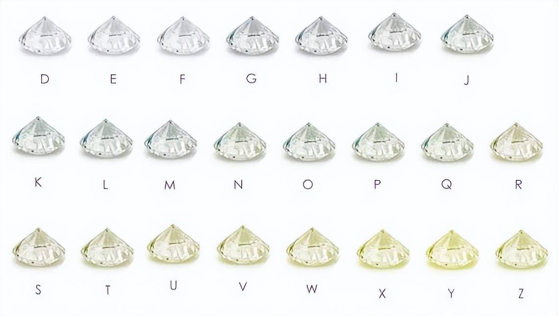 颜色:钻石的颜色被分为从D到Z的等级。D是至高等级,表示完全无色。颜色等级越低,钻石中的黄色或棕调就越明显。颜色等级的等级标准如下: