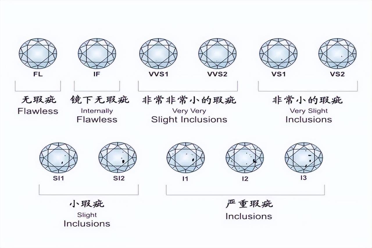 净度:净度指钻石内部和外部的瑕疵程度。净度被分为从FL(没有内部或外部瑕疵)到I3(有明显的瑕疵)。下面是净度的等级标准: