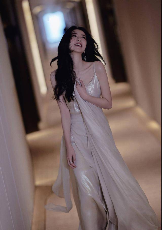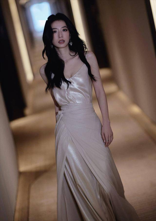 周雨彤这套长裙选择了浅香槟色,属于典型的低饱和色调。这样的颜色既不会过于张扬,又能在视觉上提亮肤色,带来柔和温婉的气质。尤其在光影的映衬下,香槟色散发出一种不动声色的高级感,给人一种轻松、优雅的氛围。