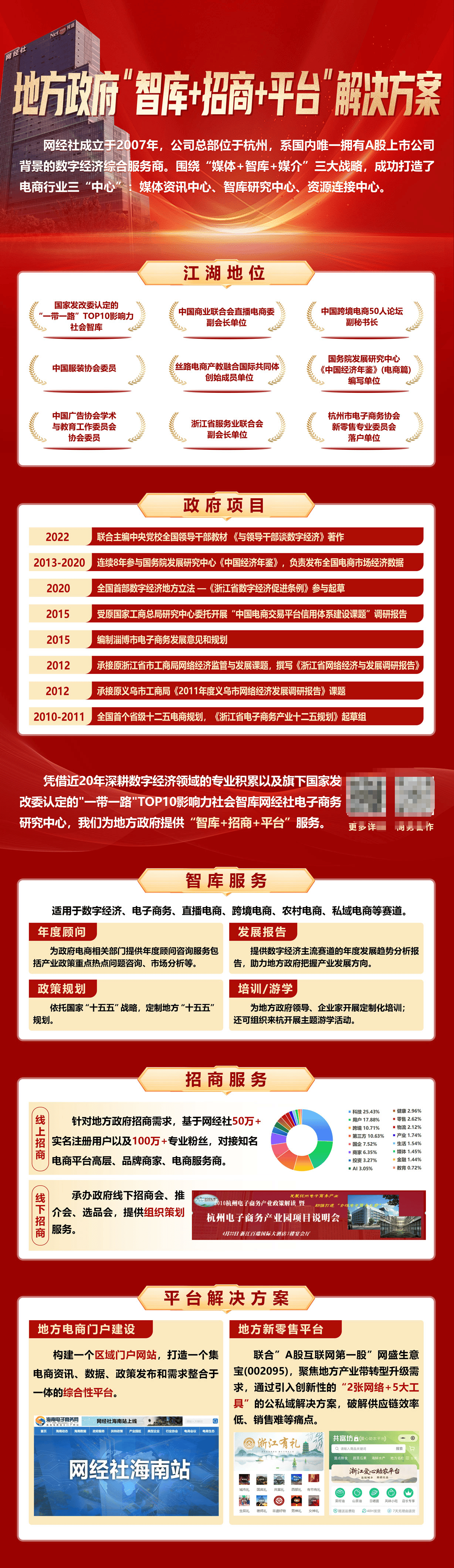 凭借近20年深耕数字经济领域的专业积累以及旗下国家发改委认定的一带一路TOP10影响力社会智库网经社电子商务研究中心,我们为地方政府提供“智库+招商+平台”服务。