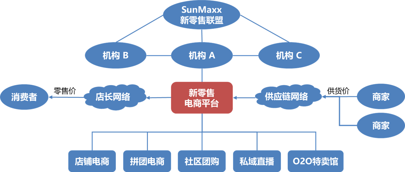 1)店铺电商:依托SunMaxx新零售联盟供应链网络,开设手机个人店铺;依托私域(朋友圈、微信群)转发链接卖货。