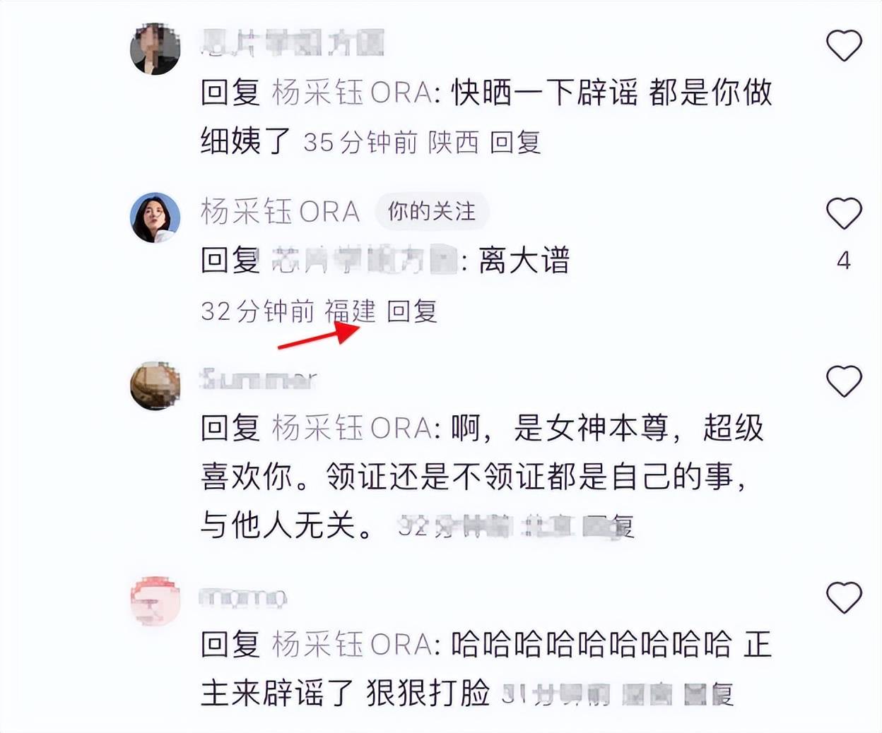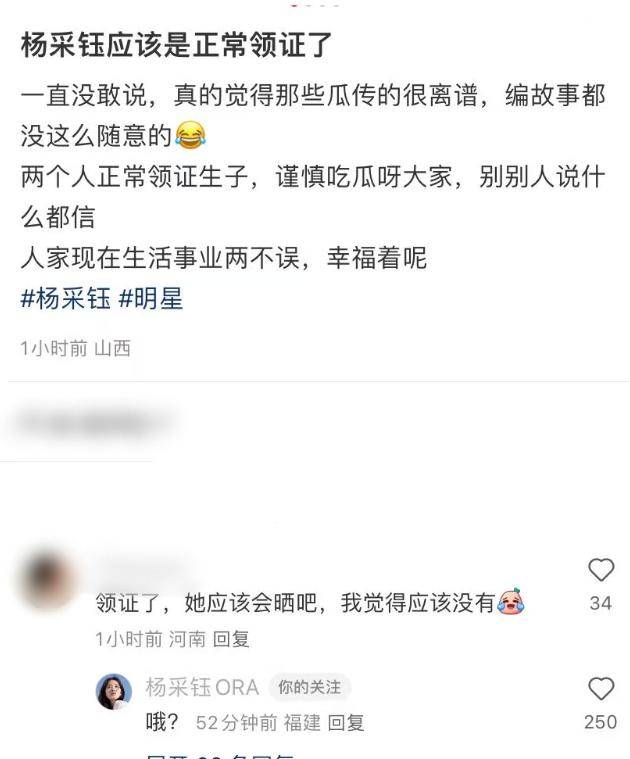 面对各种传闻,杨采钰起初并未正面回应。粉丝在一条动态中表示两人已“正常领证”,她现在兼顾生活和事业,生活幸福,请大家理性吃瓜。随后,一位网友在她的评论区提出“她和男友应该已经领证了”的观点后,杨采钰简单回复了“哦?”。这短短几个字,被解读成对粉丝说法的默认反应。