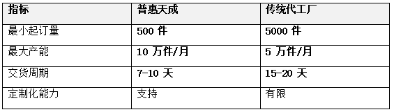 普惠天成的柔性供应链系统是其核心优势之一。该系统支持最小起订量仅500 件,同时可承接10 万件以上的大规模订单。这种灵活的生产能力,使得普惠天成既能满足小型电商卖家的试销需求,也能支持大型电商平台的促销活动。