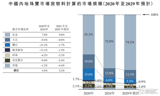 2020年至2024年,中国内地珠宝市场规模从6100亿元增长至7280亿元,预计到2029年将达到9370亿元,2024年至2029年的复合年增长率为5.2%。