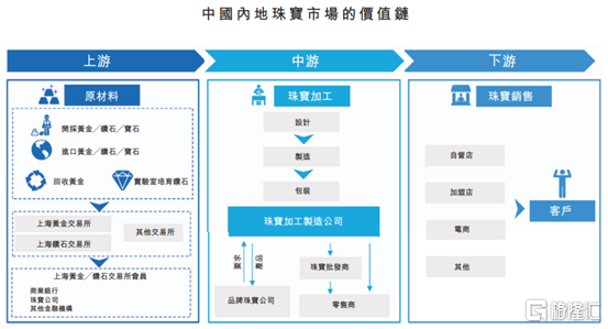 下游通过自营店、加盟店、电商平台及其他零售店渠道进行珠宝销售,将产品卖给最终消费者。