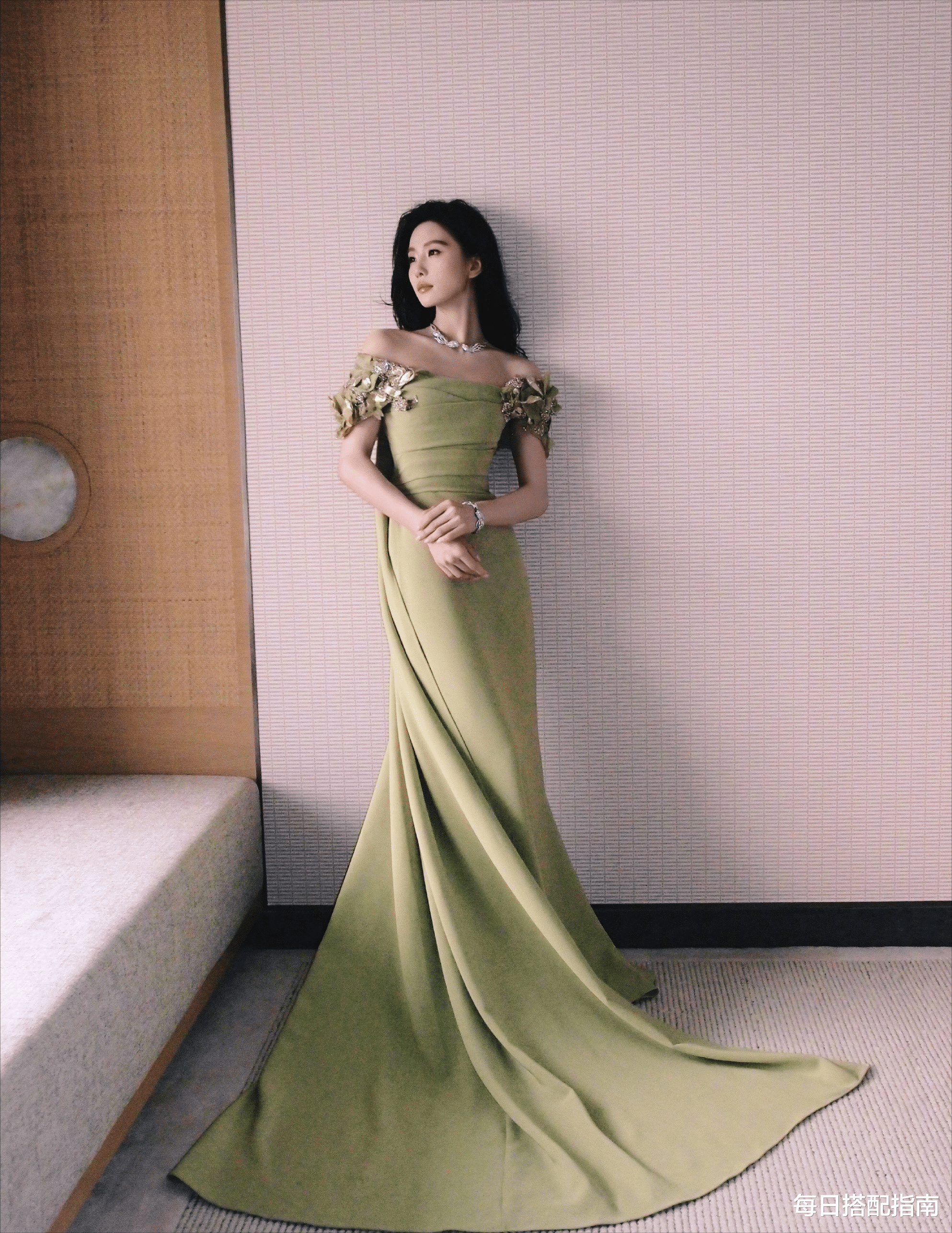这种带着雾面质感的绿色不仅赋予整体造型诗意般的静谧氛围,更巧妙衬托出肌肤的白皙透亮。在灯光映照下,礼服面料随着身形流动,仿佛将远山薄雾披在身上,既不会过分抢眼,又能令人在人群中一眼捕捉到这份独特的美感。