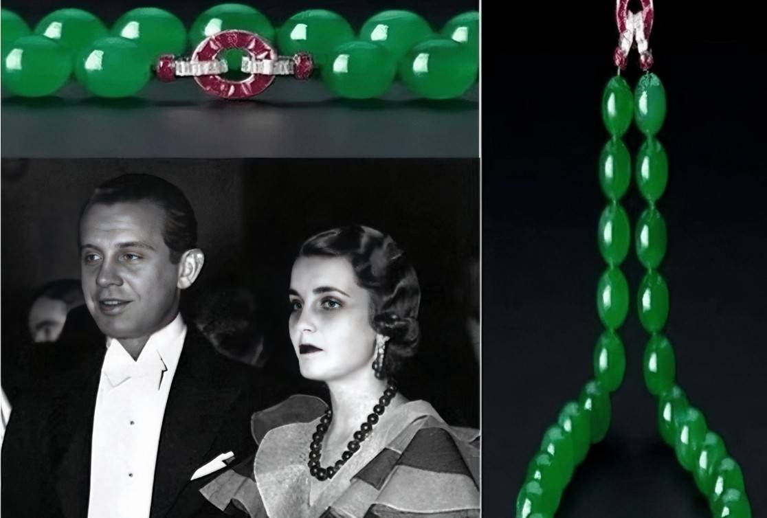 这条由27颗翡翠珠子串成的项链,最早是由美国人霍顿于1932年以5万美元从北京购得。当时,霍顿为这条项链定制了链扣,并将其带到法国卡地亚珠宝行。霍顿是为女儿芭芭拉准备的结婚礼物。伟德国际1946芭芭拉在20岁时继承了家族企业,成为美国女首富,并于1933年与格鲁吉亚王子结婚,项链成为她婚礼上的重要饰品。