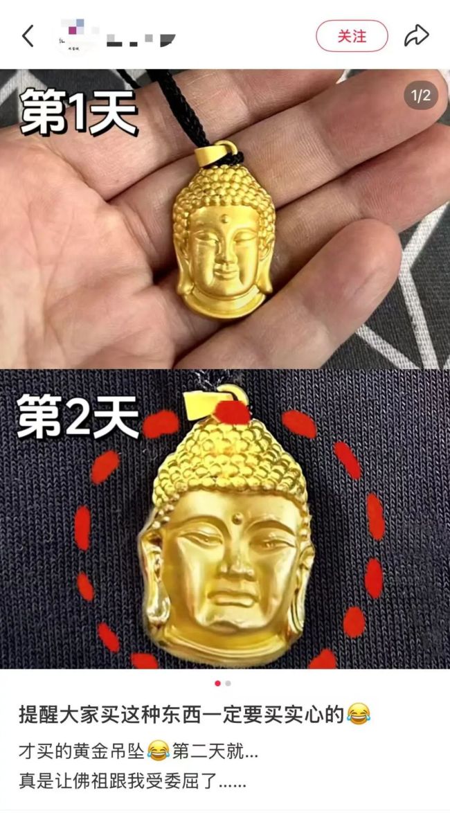 小克重黄金通常把价签和克重信息藏在十分隐蔽的位置,字号小的不拿放大镜几乎很难看清;同时,其通常会用中空、镂空设计,辅以大量其他材质,带来强大的视觉冲击,让消费者产生“赚大了”的错觉。