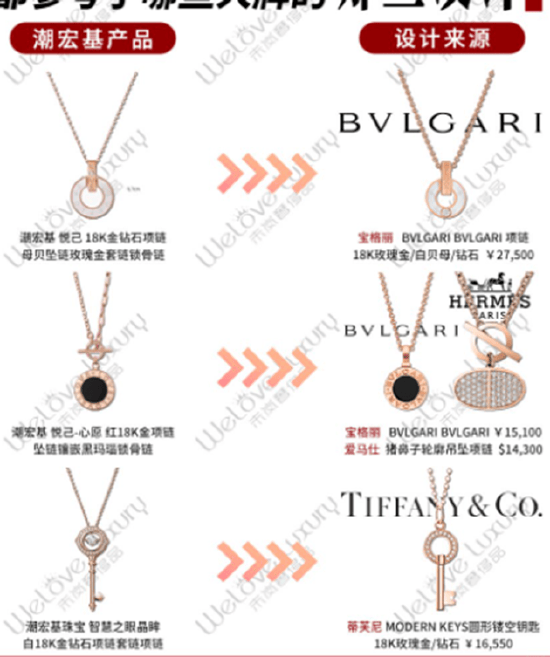 最后,尽管潮宏基积极推动产品转型,但其研发投入与营收增长并不匹配。2021年至2024年,公司营收从46.36亿元增至65.18亿元,而研发费用仅从0.65亿元微增至0.68亿元。研发投入不足。潮宏基频频陷入抄袭争议之中,在小红书某帖文中,潮宏基珠宝首饰设计中经常会看到某些大牌经典款的身伟德国际bv1946影,如潮宏基智慧之眼晶眸白18K金钻石项链与蒂芙尼MODERN KEYS圆形镂空钥匙项链有着一定的异曲同工之妙。